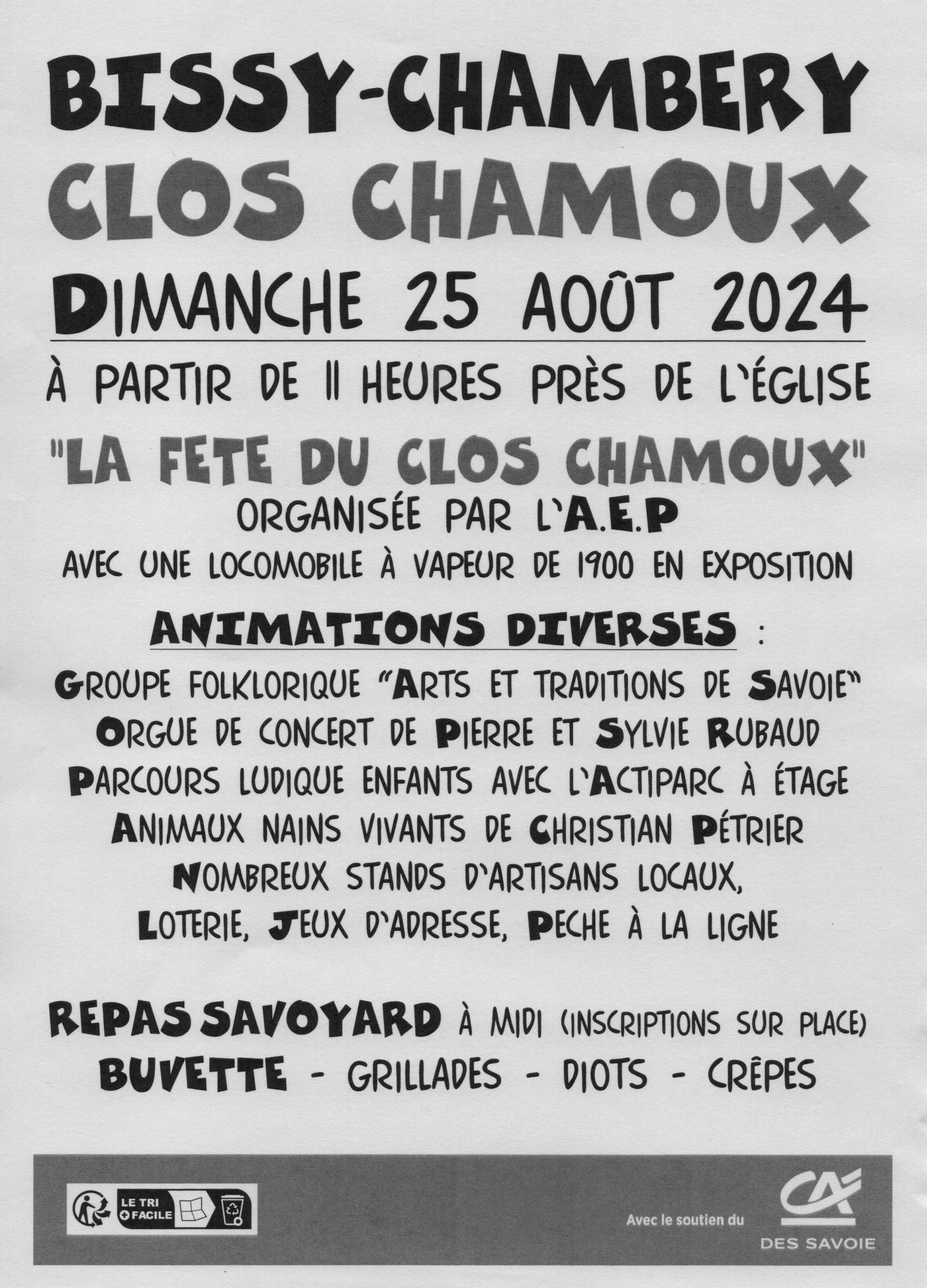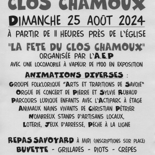 Ne manquez pas la traditionnelle Fête du Clos Chamoux (anciennement La Fête du Blé), organisée par l’A.E.P, qui a lieu dans un mois : Dimanche 31 août 2025